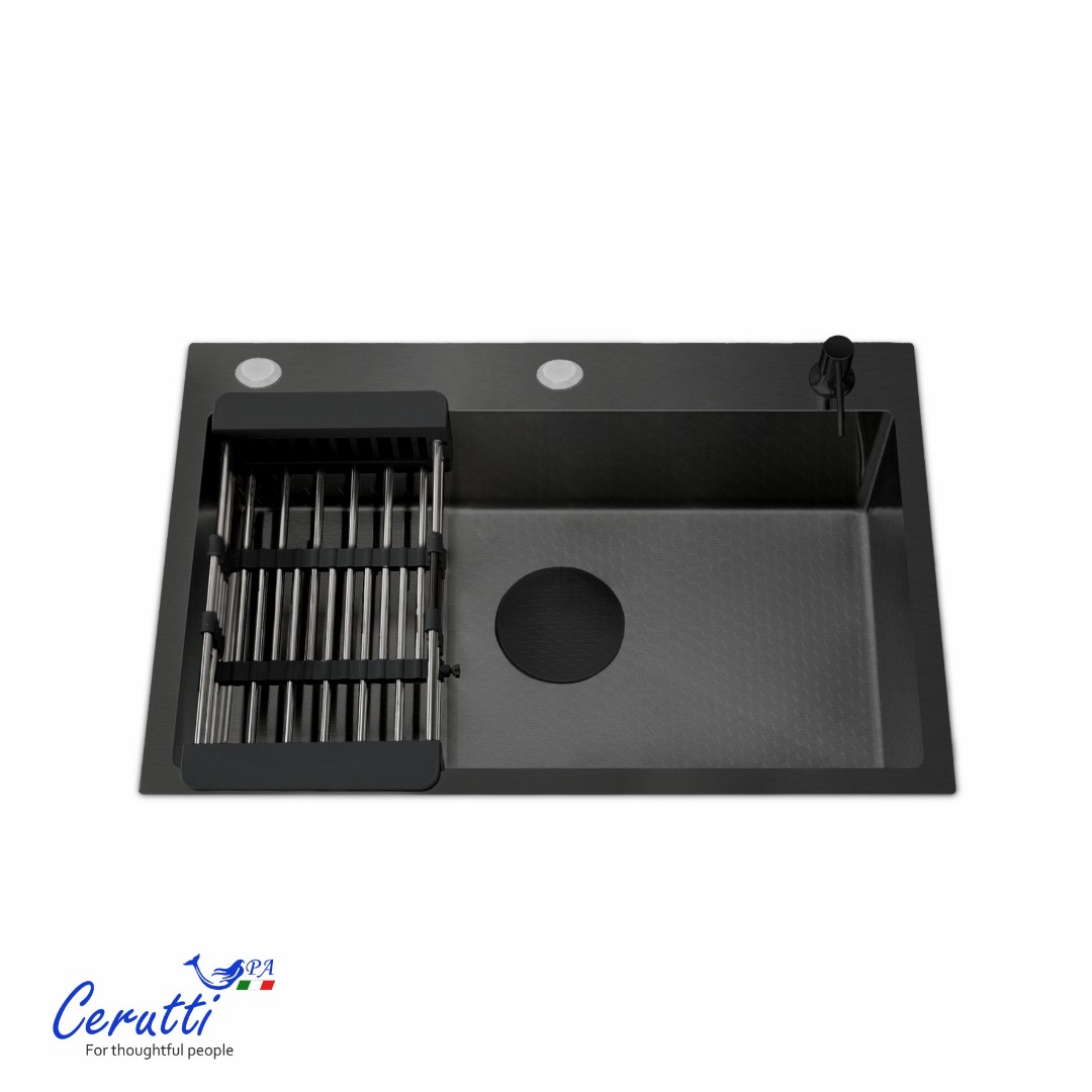 - Мойка из нержавеющей стали с рифленым PVD покрытием, способствующему ее легкой очистке (поверхность защищена от контакта с маслами и жирами, являющимися основными элементами загрязнения на кухне) и повышенной износостойкости, так как она не подвержена царапинам и на ней не скапливается вода.