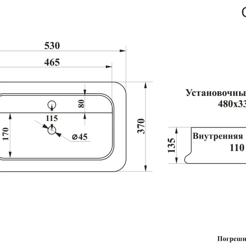 Прямоугольная накладная раковина с отверстием под смеситель 530х370х135 мм.
