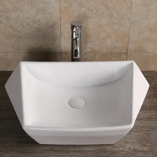 Накладная белая трапециевидная раковина станет украшением ванной комнаты в современном стиле.