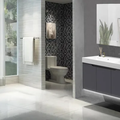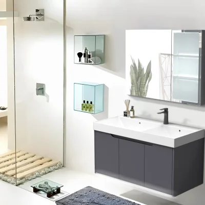- Зеркальный шкаф с подсветкой полок за стеклянной дверцей. Подсветка включается по датчику движения.