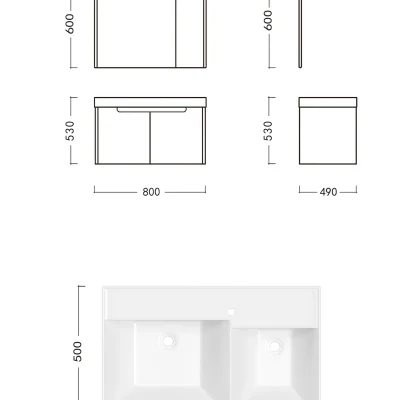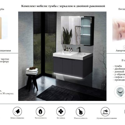 В комплекте: двойная раковина, 2 донных клапана, 2 сифона с фильтром-затвором, У-образный сливной шланг, электрическая вилка для включения подсветки зеркального шкафа. Смеситель приобретается отдельно.