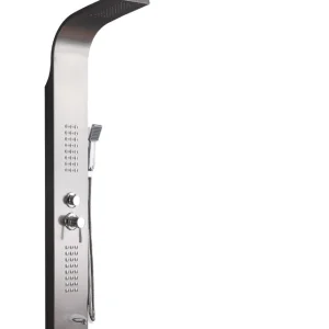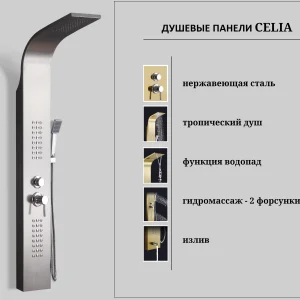 Стильная душевая панель с гидромассажем, с тропическим душем и каскадным водопадом подарит эстетическое и чувственное наслаждение. Цвет стальной матовый.