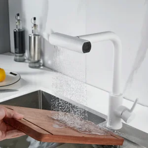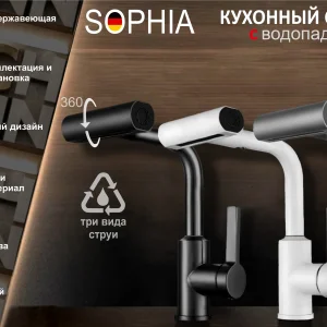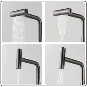 - Лейка имеет 4 режима: режим-1 "стандарт" (через аэратор), режим-2 "лезвие" (плоская струя с усиленным напором), режим-3 "ливень" (принцип душевой лейки); режим-4 "каскадный водопад"